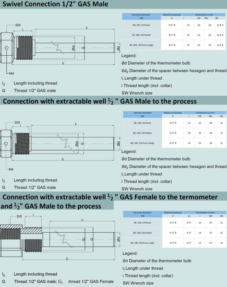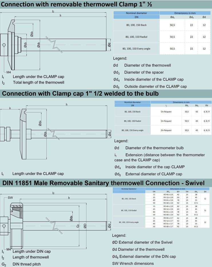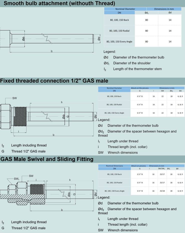 Thermometers are constructed with a sensing element with nitrogen or bimetallic expansion. Sensitive bulbs are normally protected with a removable tube in the most suitable material.