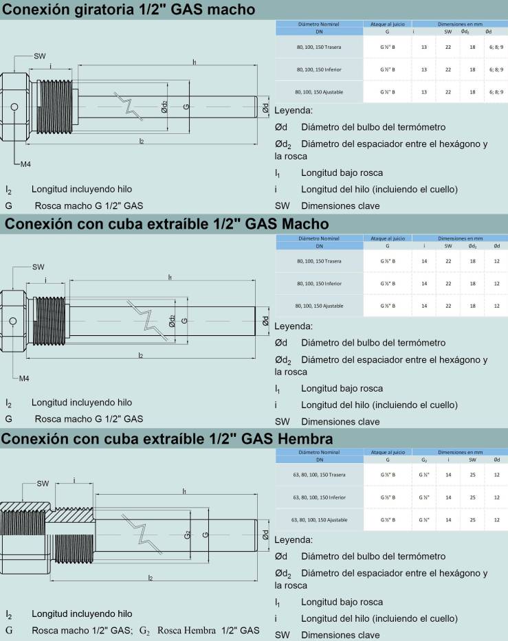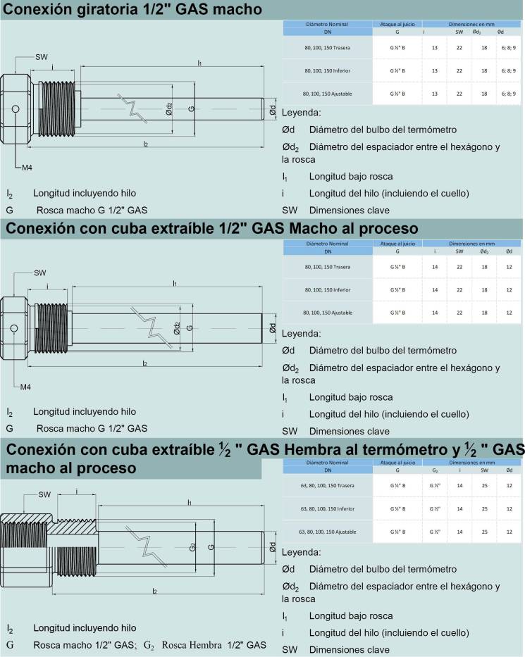 Conexión del proceso: lisa o con accesorio deslizante o completa con 1/2 "GAS extraíble o sanitarios DIN 11851, CLAMP, SMS, IDF.