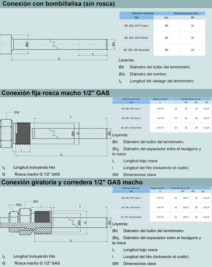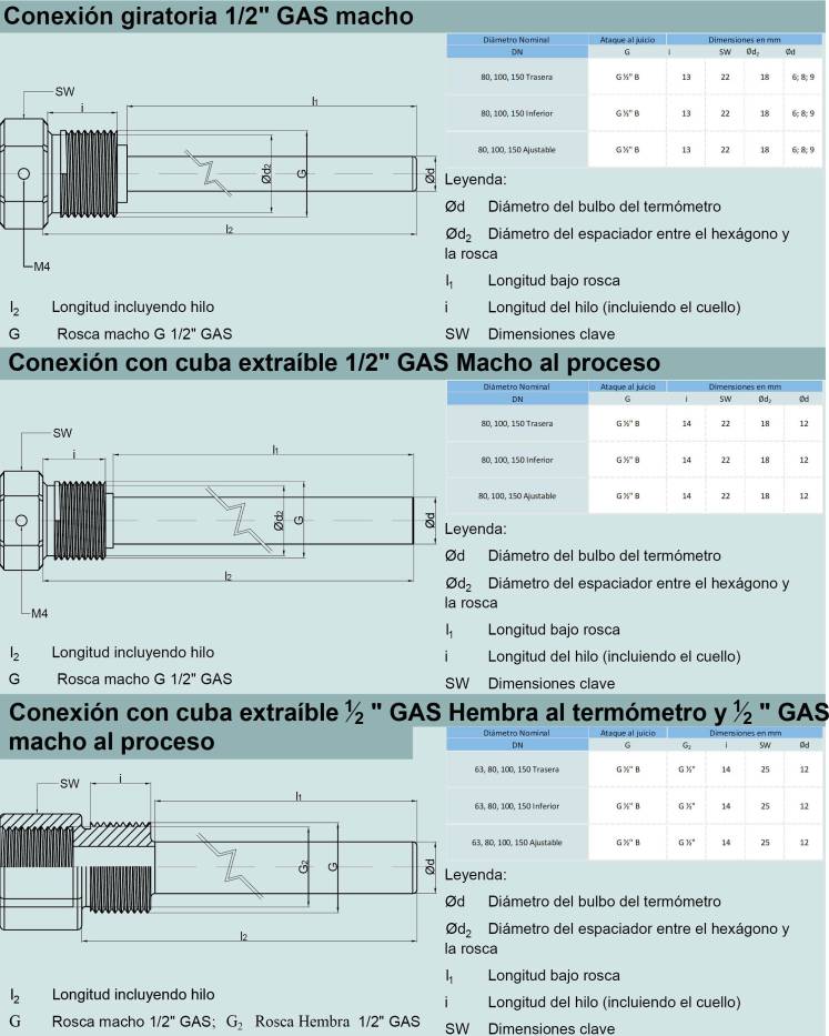 Conexión del proceso: lisa o con accesorio deslizante o completa con 1/2 "GAS extraíble o sanitarios DIN 11851, CLAMP, SMS, IDF.