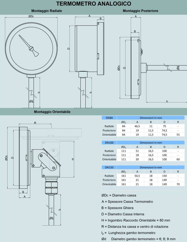 I termometri sono costruiti con elemento sensibile a dilatazione di azoto o bimetallico. I bulbi sensibili sono normalmente protetti con guaina estraibile a pozzetto nel materiale più adatto.