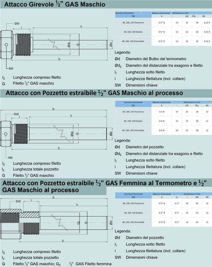 Attacco al processo: liscio o fisso o con raccordino scorrevole o completi di pozzetto estraibile 1/2" GAS o sanitario DIN 11851 DN 25-40-50, CLAMP 1 1/2” 2”, SMS, IDF.